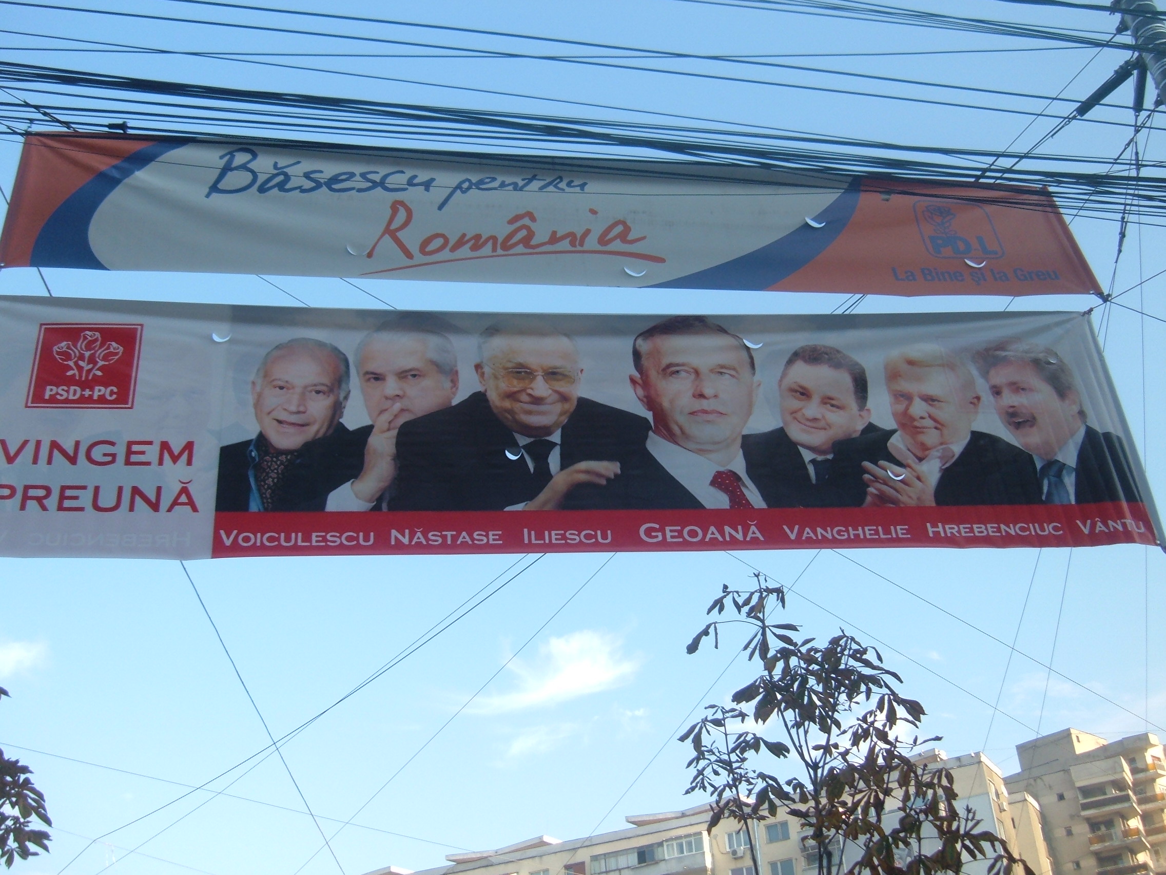 Da’ afisul cu Videanu, Berceanu, Udrea, etc in spatele lui Basescu, pe fond portocaliu albastru (exact ca alea oficiale) si cu titlu „Noi furam cel mai bine” ? Sunt puse cu cel putin o saptamana inainte de primul tur. Ca sa nu mai zic de „Traiti bine?” pe fond negru cu care e impanzit jumatate de Bucuresti, sau d-alea mai melodramatice cu Titanicu si „Basescu scufunda Romania”.